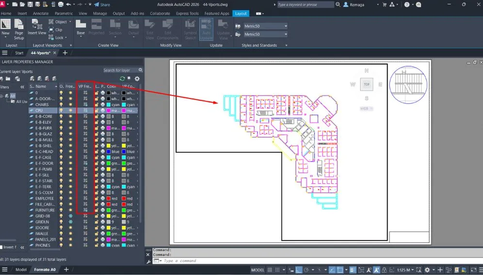 Cada viewport possui sua própria configuração de visibilidade de camadas, desde que esteja ativa. Isso significa que você pode congelar ou exibir layers de forma isolada, sem afetar as demais viewports.