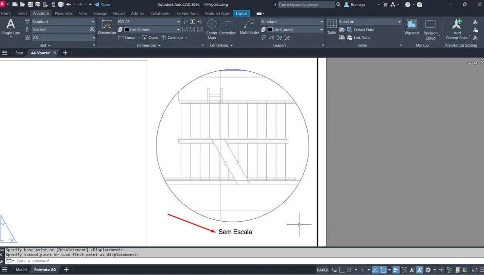 Controlar anotações no layout em uma viewport circular com detalhe técnico ampliado e anotação de texto indicando ausência de escala.
