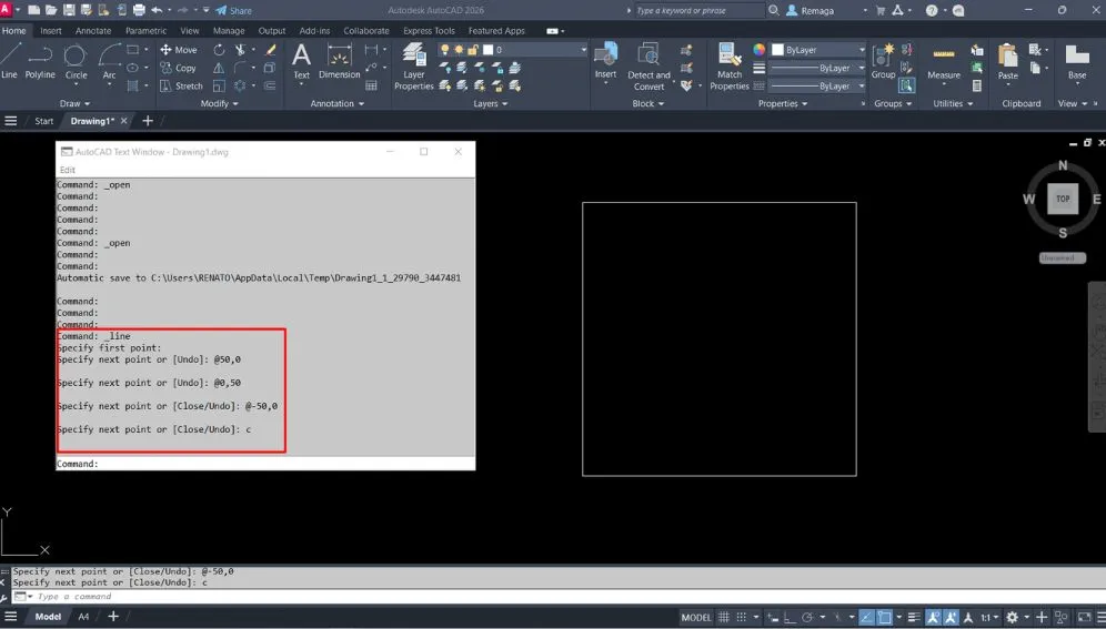Se você abrir o F2 (Janela de Histórico), perceberá que o AutoCAD inseriu automaticamente o @ em cada coordenada, confirmando que o desenho foi feito com base em coordenadas relativas.