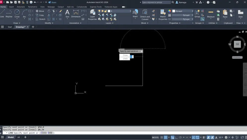 Entrada dinâmica no AutoCAD ativada, permitindo inserir coordenadas e acessar opções como Close e Undo diretamente no cursor