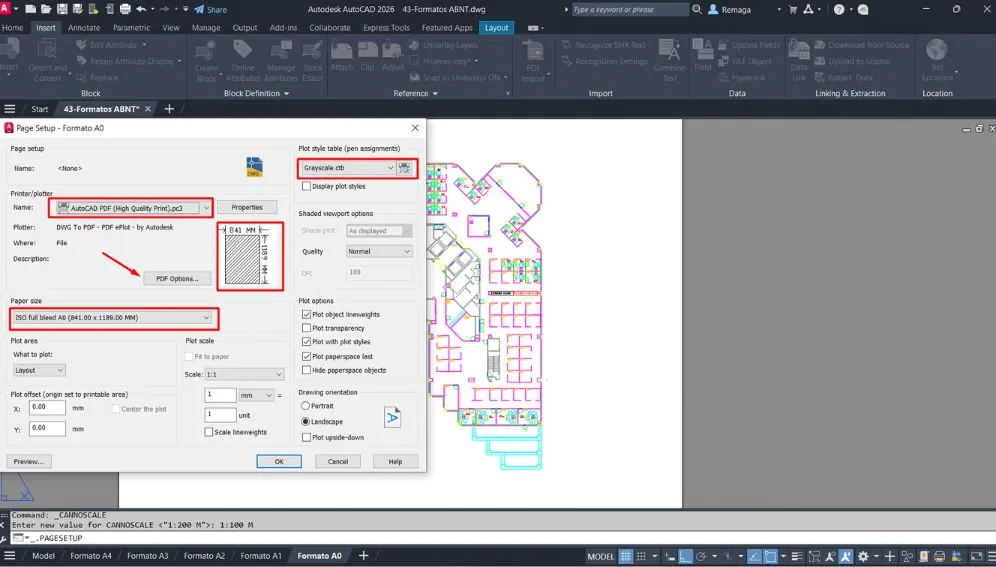 Através da janela “Page Setup”, é possível configurar o tamanho de papel, estilo de plotagem e impressora para gerar um PDF técnico de alta qualidade.