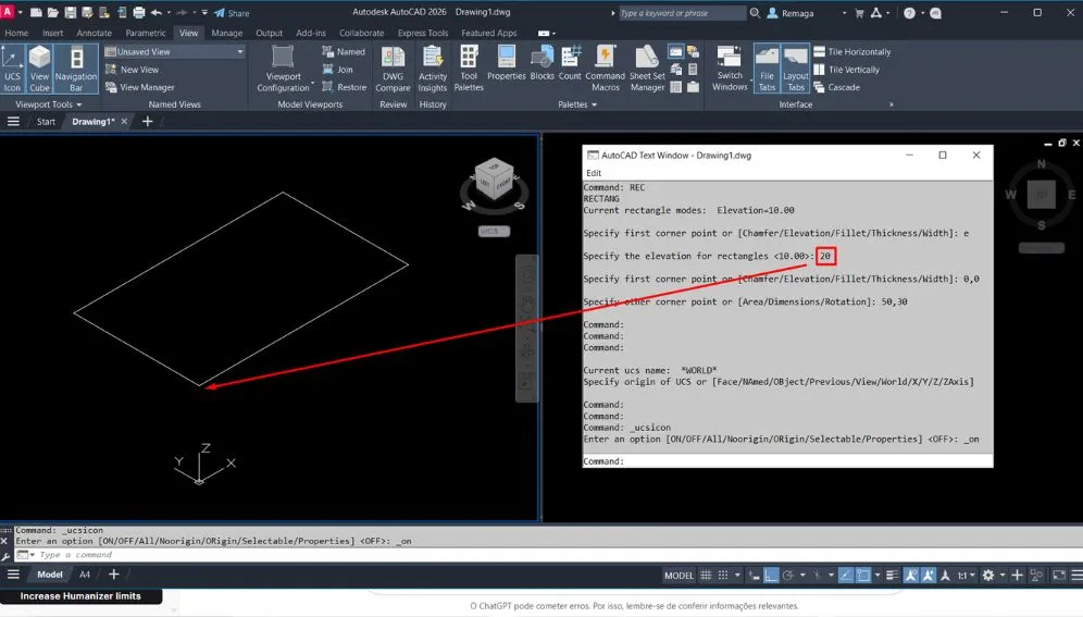 Ao aplicar o valor de Elevation no comando Rectangle, você projeta o retângulo acima do plano XY, facilitando a visualização em perspectivas realistas ou isométricas.
