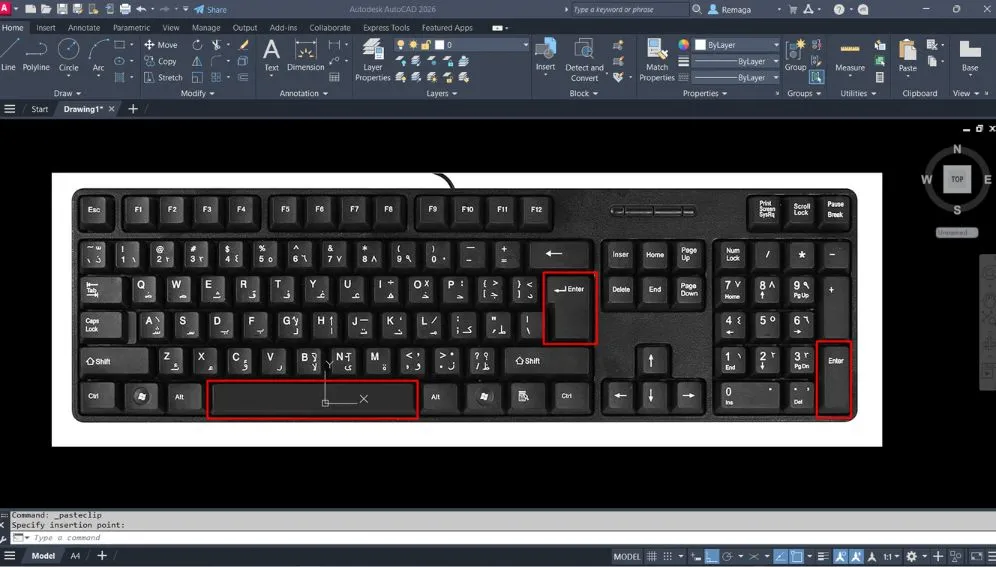 Teclas Enter e Espaço destacadas no teclado como atalhos para repetir o último comando no AutoCAD de forma rápida